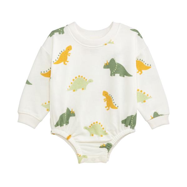 Dino Baby Sweatshirt Bubble offers a delightful blend of comfort and style for your little one. Crafted from soft brushed French terry fabric, this sweatshirt bubble ensures a cozy feel against delicate skin. The cotton rib neckline and sleeve openings provide a snug fit, while the inner leg snaps make diaper changes a breeze. Designed for babies aged 0-3 months up to 6-9 months, this adorable piece features a charming dinosaur print that adds a playful touch to any outfit. Made with a durable blend of 58% cotton and 42% polyester, it promises both breathability and longevity, making it a perfect addition to your baby's wardrobe.