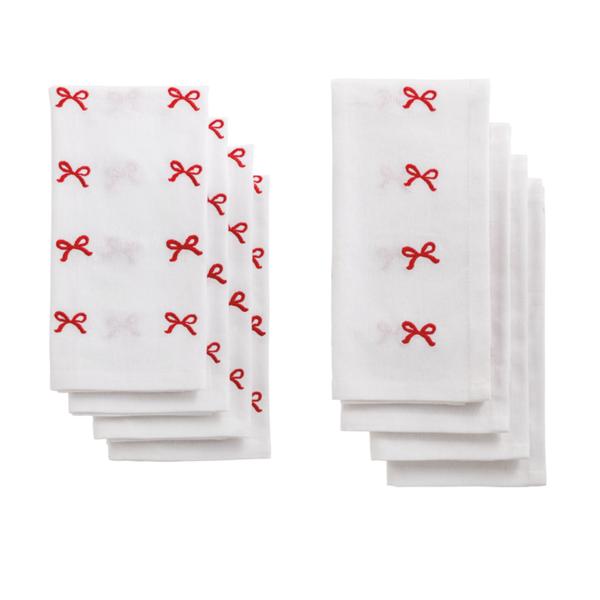 Elevate your dining experience with this exquisite Bow Embroidered Napkin Set. Each set includes four beautifully crafted cotton dinner napkins, designed to add a touch of elegance to any table setting. Measuring 18" x 18", these napkins are perfect for both everyday meals and special occasions. The intricate bow embroidery adds a charming detail, while the hemstitching provides a classic finish. Made from 100% cotton, these napkins are not only soft and absorbent but also durable and easy to care for. Whether you're hosting a dinner party or enjoying a quiet meal at home, these napkins will enhance your table decor and impress your guests.