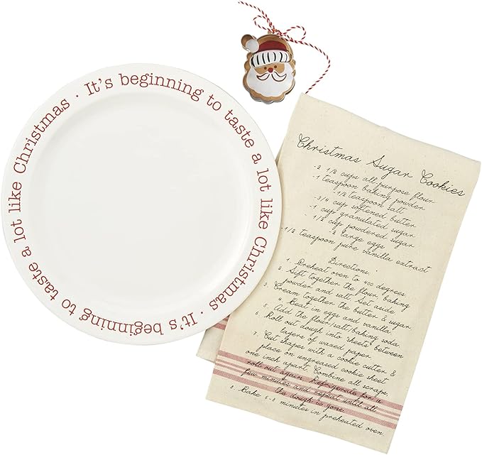 - 3-piece set. Ceramic cookie plate comes with cotton hand towel and metal cookie cutter.