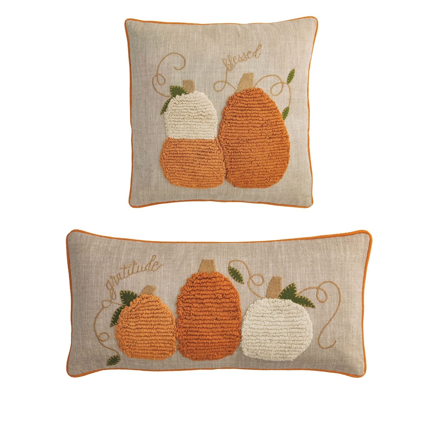 Cozy up your home for the autumn season with these beautifully textured tufted pumpkin pillows, available in both a large lumbar size and a small square design. Each chambray pillow showcases richly detailed tufted felt appliqués, a piped edge for a refined finish, and a soft felt backing with a convenient zipper closure. These warm, seasonal accents are perfect for sofas, beds, entryway benches, or any fall‑themed décor display.