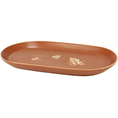 An oval stoneware platter displaying an autumn brown color with three debossed cream fall leaf designs in the center. Platter features bare ceramic along the rim. Our Fall Leaves oval platter is microwave, dishwasher, and food safe for convenient use. A piece of rustic tableware perfect for seasonal gatherings.