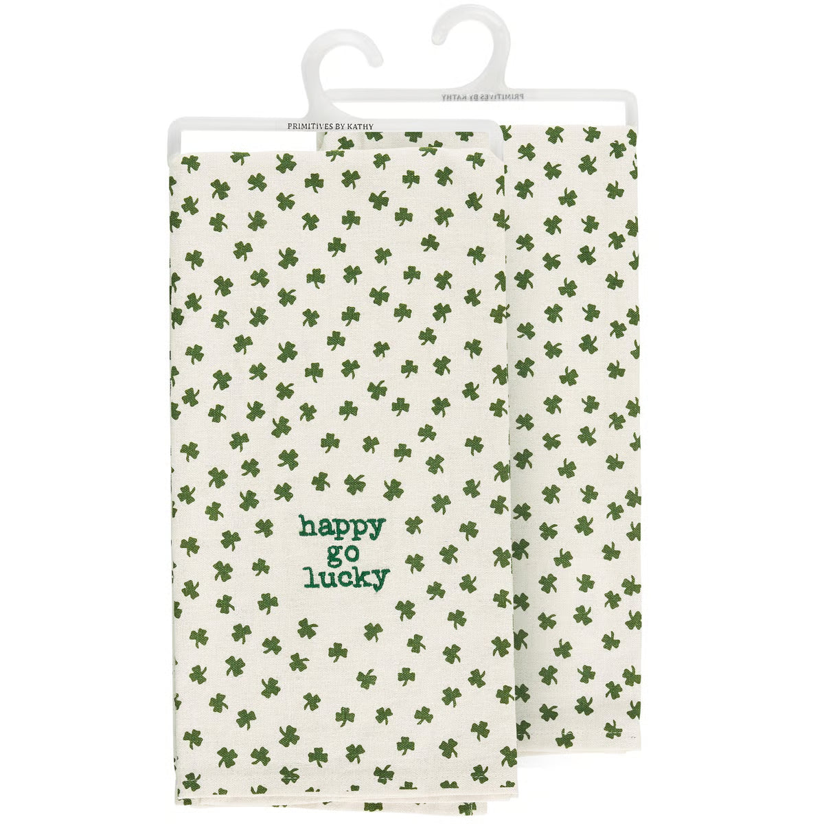 A cotton-linen blend kitchen towel displaying an all-over print of shamrocks with an embroidered seasonal sentiment that reads "Happy Go Lucky." Our Happy Go Lucky kitchen towel is machine-washable for convenient cleaning. Packaged on a clear plastic hanger to easily display on rack. A fun St. Patrick's Day-themed kitchen accessory perfect for seasonal use.