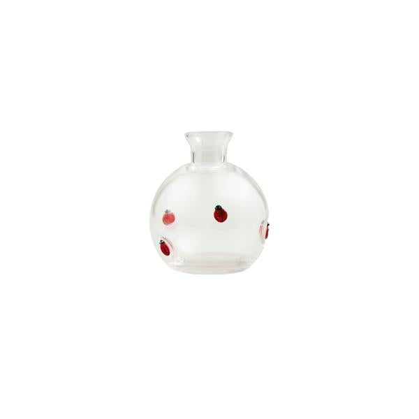 Glass Lady Bug Vase. This charming glass bud vase features a delightful inlaid icon exterior, adding a touch of whimsy and elegance to any space. With its compact dimensions of 5 inches in height and a 4-inch diameter, it is perfect for showcasing a single bloom or a small bouquet. Crafted from high-quality glass, this vase is both durable and stylish, making it an ideal decorative piece for your home or office. Its unique design and vibrant details make it a standout addition to any decor, bringing a playful yet sophisticated charm to your surroundings.