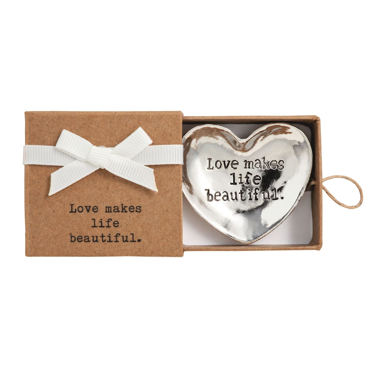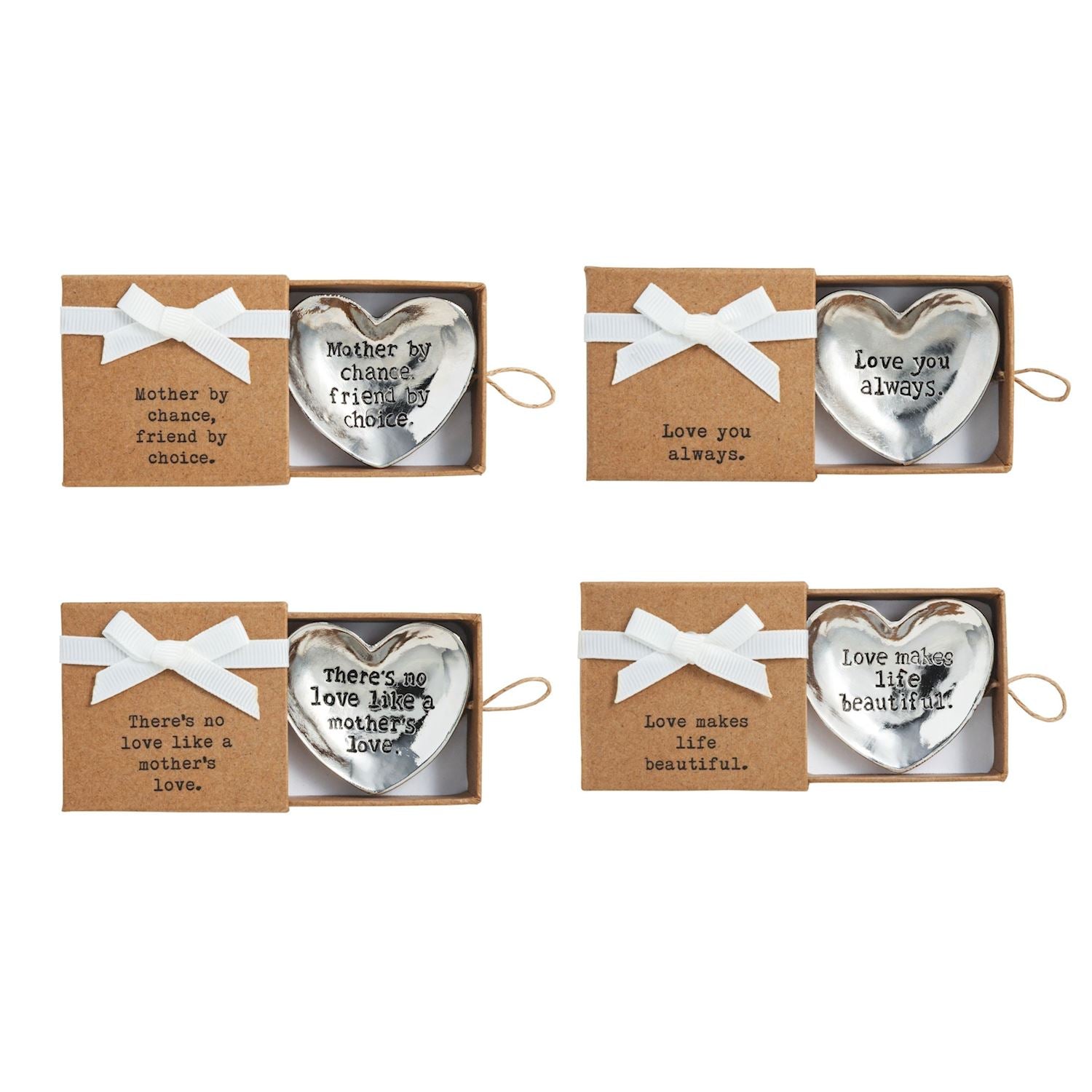 This stamped metal heart‑shaped trinket dish brings a touch of charm and sentiment to any space. Its textured stamped design creates a lovely handcrafted feel, perfect for holding jewelry, keys, coins, or small keepsakes. Each dish comes packaged in an embellished gift box featuring heartfelt, sentimental statements—making it a thoughtful ready‑to‑give piece for birthdays, encouragement, friendship, or everyday appreciation.