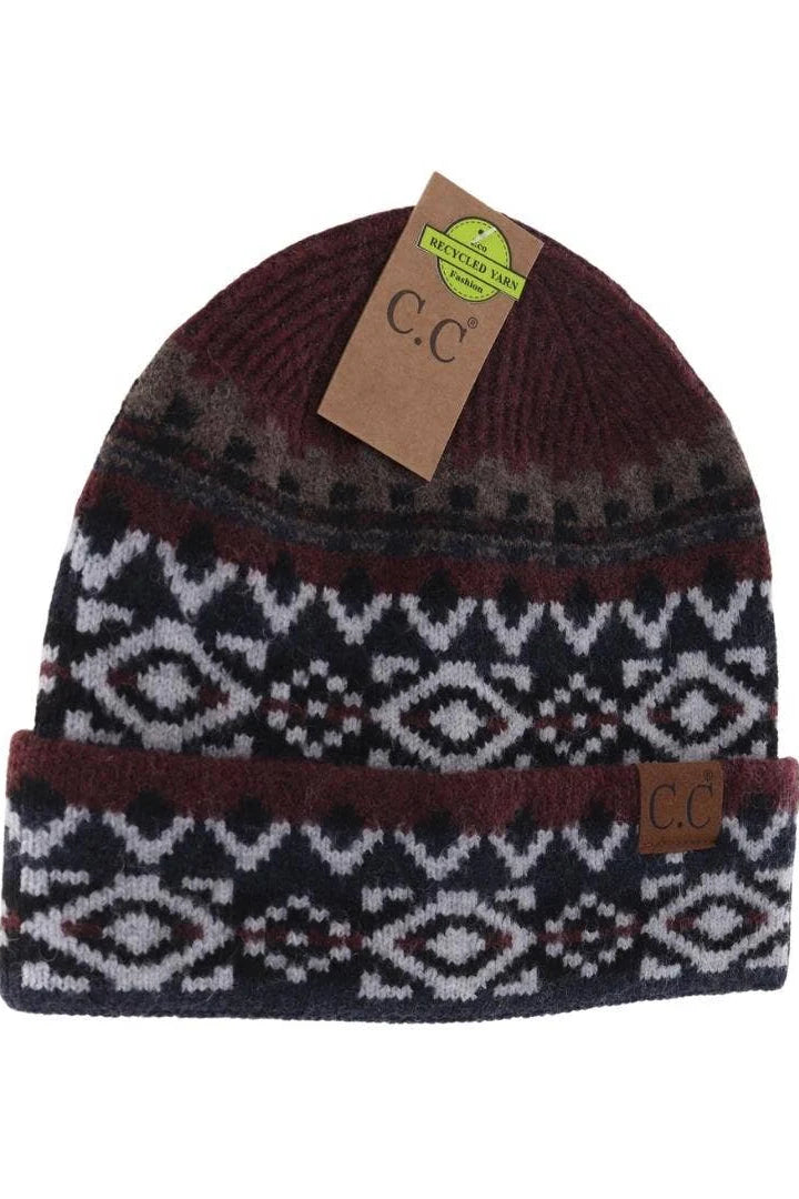 Stay cozy and stylish this season with the C.C Aztec Pattern Cuff Beanie. Crafted from a sustainable blend of 61% recycled polyester, plus cashmere, wool, and spandex for softness and stretch, this beanie offers both warmth and comfort. The Aztec-inspired cuff design makes it a versatile accessory that pairs effortlessly with any winter outfit. Designed in one size fits most, it’s perfect for gifting or adding a chic touch to your cold-weather wardrobe.