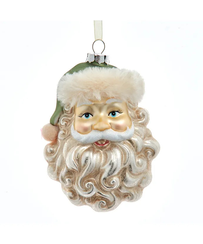 Add a festive touch to your holiday decor with Kurt Adler's Glass Santa Head With Green Hat Ornament. This charming ornament features a beautifully crafted Santa head, complete with a playful green hat that adds a pop of color and a whimsical twist to the classic holiday figure. Meticulously designed with intricate detailing, this glass ornament showcases Santa's jolly expression and classic features, making it a delightful addition to your Christmas tree or festive displays. The vibrant green hat complements the traditional red and white of Santa’s attire, creating a cheerful and inviting look.