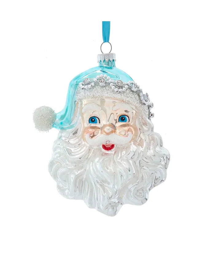 This blue and silver glass Santa head ornament from Kurt Adler is a wonderful addition to any holiday décor or Christmas tree. Each Santa features a blue and silver glittered Santa hat with clear gemstone accents.