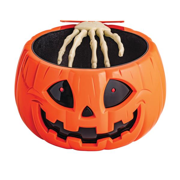 Delight your guests with this captivating Animated Jack-O-Lantern Treat Bucket, perfect for adding a touch of spooky charm to your Halloween festivities. This unique candy bowl features a motion-activated haunted hand that surprises and entertains with every reach. The LED lights create an eerie glow, enhancing the Halloween atmosphere, while the accompanying sound effects add an extra layer of frightful fun. Crafted from durable plastic, this bowl is designed to withstand the excitement of the season. Measuring 5 3/4" in height and 10" in diameter, it offers ample space for your favorite treats. Please note, it requires 3 AA batteries, which are not included. Ideal for parties, trick-or-treaters, or as a festive centerpiece, this animated bowl is sure to be a hit with all ages.