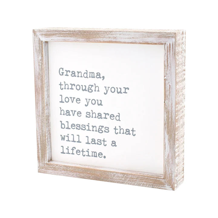 A white weathered wood framed sign with a clean white background and soft gray text featuring the heartfelt message: “Grandma, Through Your Love You Have Shared Blessings That Will Last a Lifetime.” A warm, meaningful piece perfect for gifting or everyday home décor.